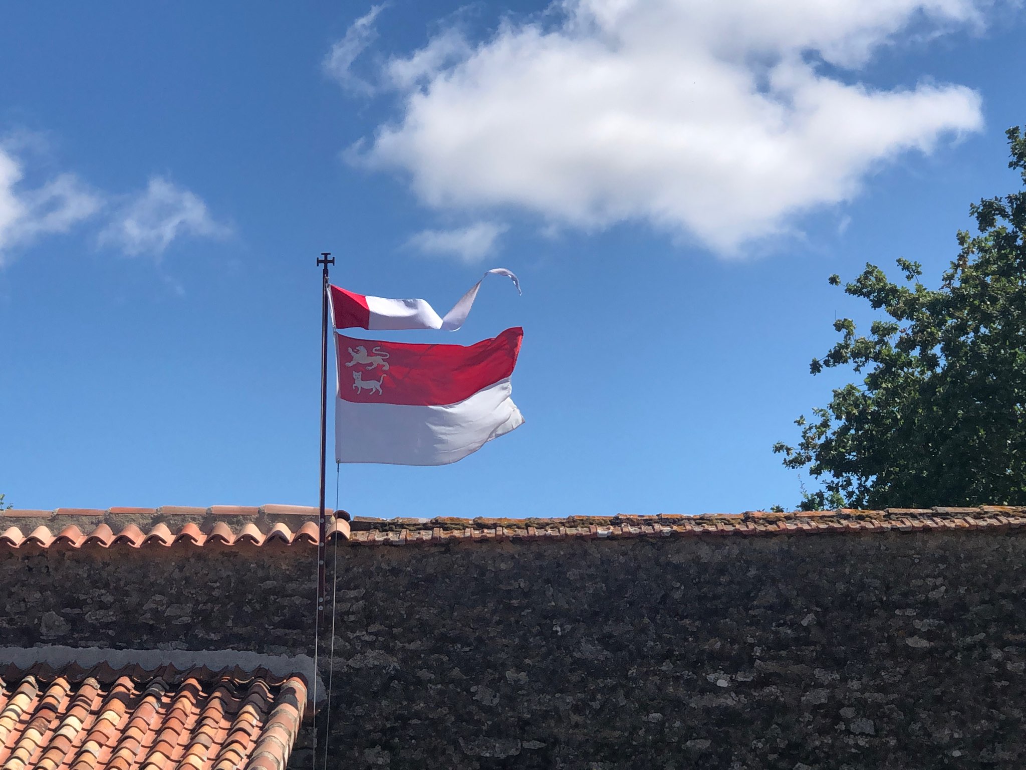 Le drapeau familial reprend les couleurs et les figures des armes familiales : « De gueules au chat d’argent surmonté d’un lion de même ».