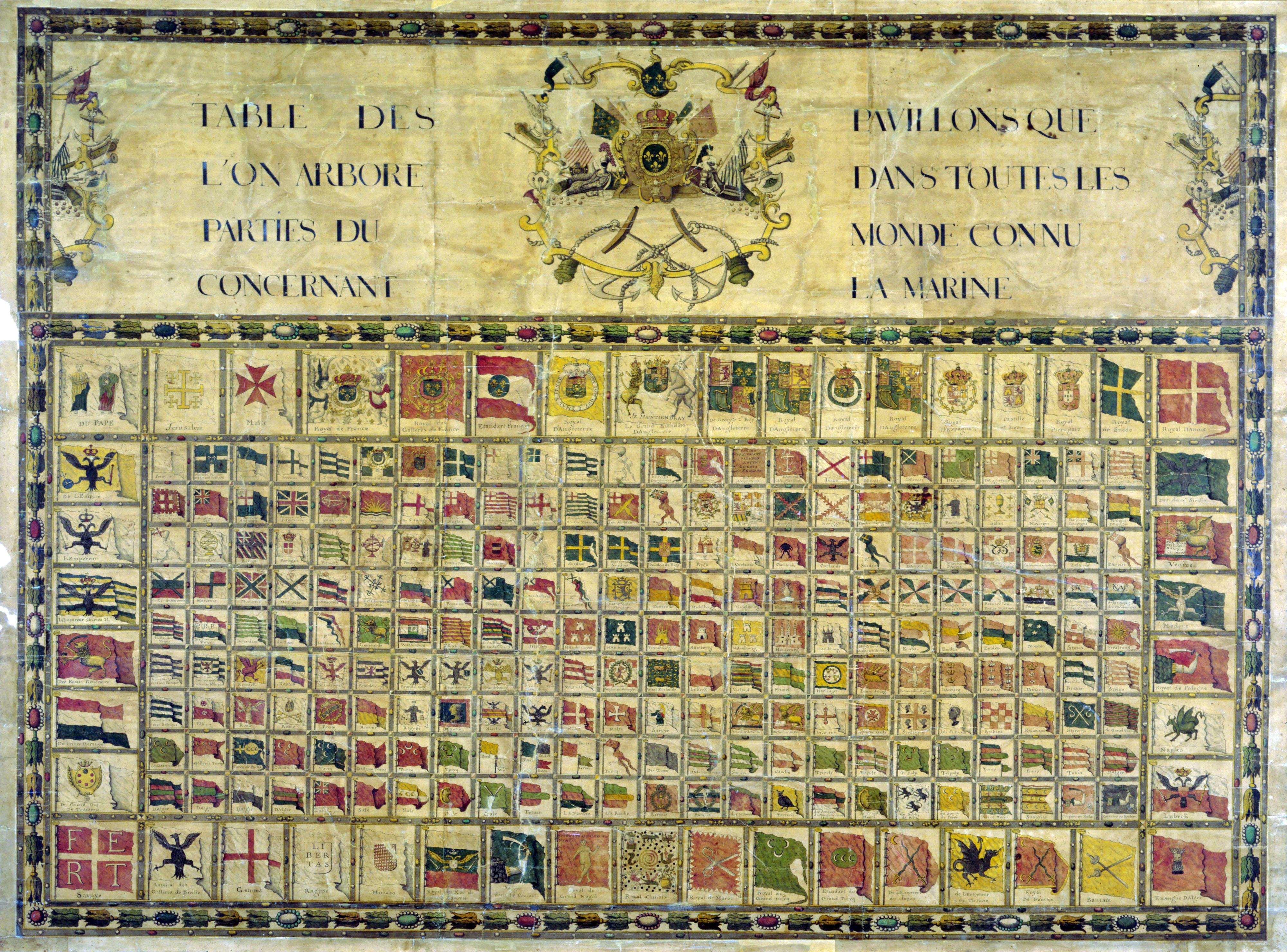 Table des pavillons que l’on arbore dans toutes les parties du monde connu concernant la Marine